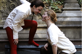 5 women play 9 characters in this highly athletic, tongue-in-cheek adaptation influenced by clowning, commedia dell’arte, and British Pantomime. Viola chases Orsino, Orsino chases Olivia, Olivia chases Viola, Sir Aguebelch chases Maria, Maria chases Malvolio, Malvolio chases Olivia, Sebastian chases his thoughts, Feste chases money… and they’re all played by the same 5 actors!
